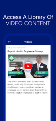 • Announcements – news and features for the Baptist Health system, searchable by facility • Important alerts – timely deadlines, weather, news and other relevant information delivered to your phone via push alert (if permitted) • Events – be in-the-know about upcoming seminars, conferences, meetings and appreciation happenings • Newsletters – view mobile editions of The Connection and Connection West • Huddles – get quick access to the day’s brief stand-up meeting • Documents – download policies and procedures related to your employment at Baptist Health • Resources – get linked to external opportunities for further access to the resources you need